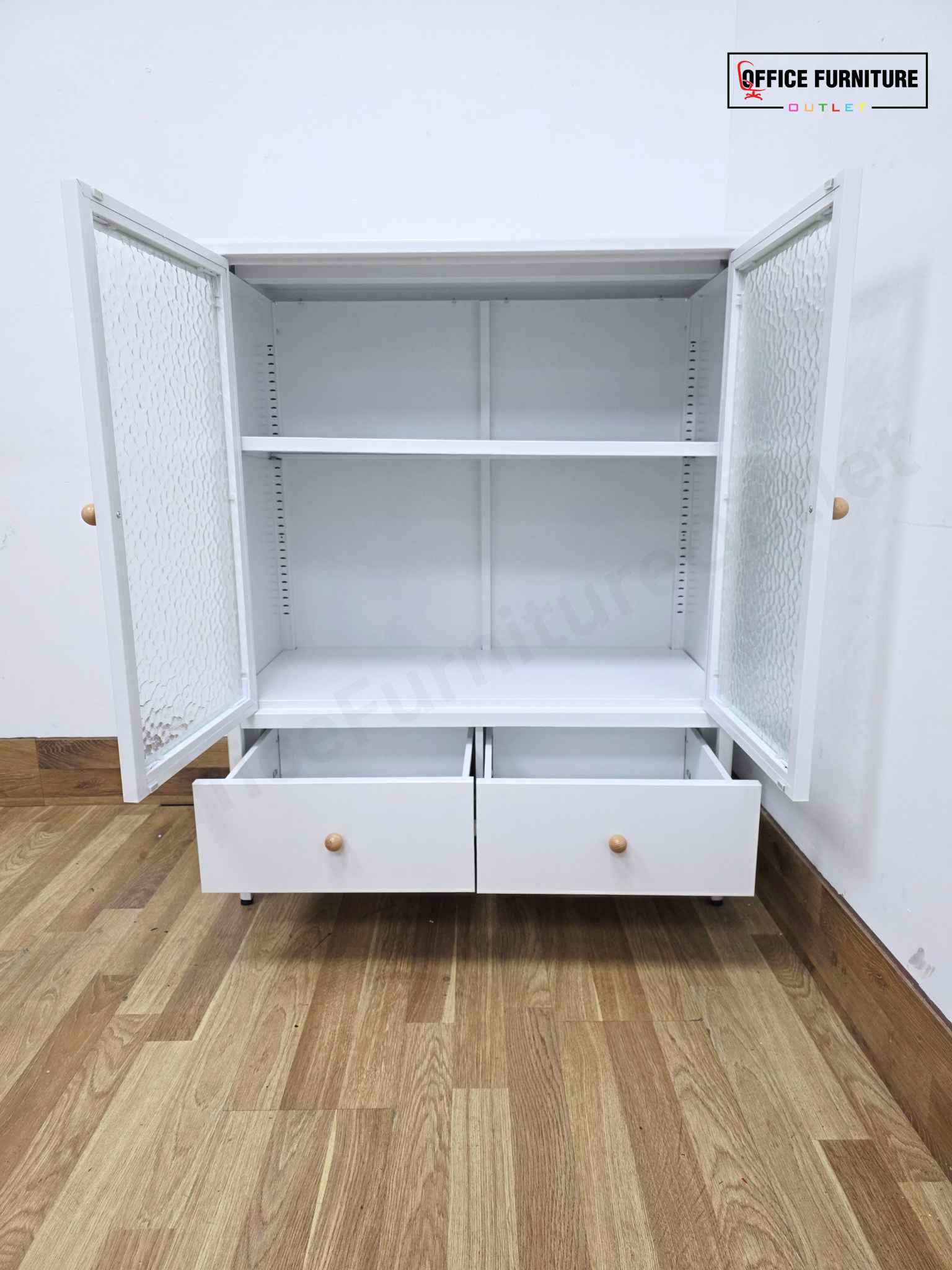 This stylish metal storage cabinet delivers a deceptively wooden appearance with the strength and reliability of steel. Designed with a clean, contemporary look, it’s a practical yet eye-catching storage solution for modern interiors. The cabinet features double bubbled glass doors at mid-level height, offering a subtle textured detail that adds character while softly obscuring contents. Beneath, two spacious drawers provide additional concealed storage, making it easy to keep essentials organised and within reach.