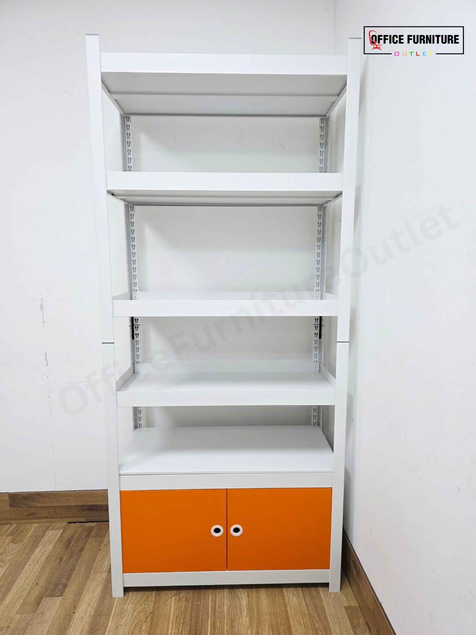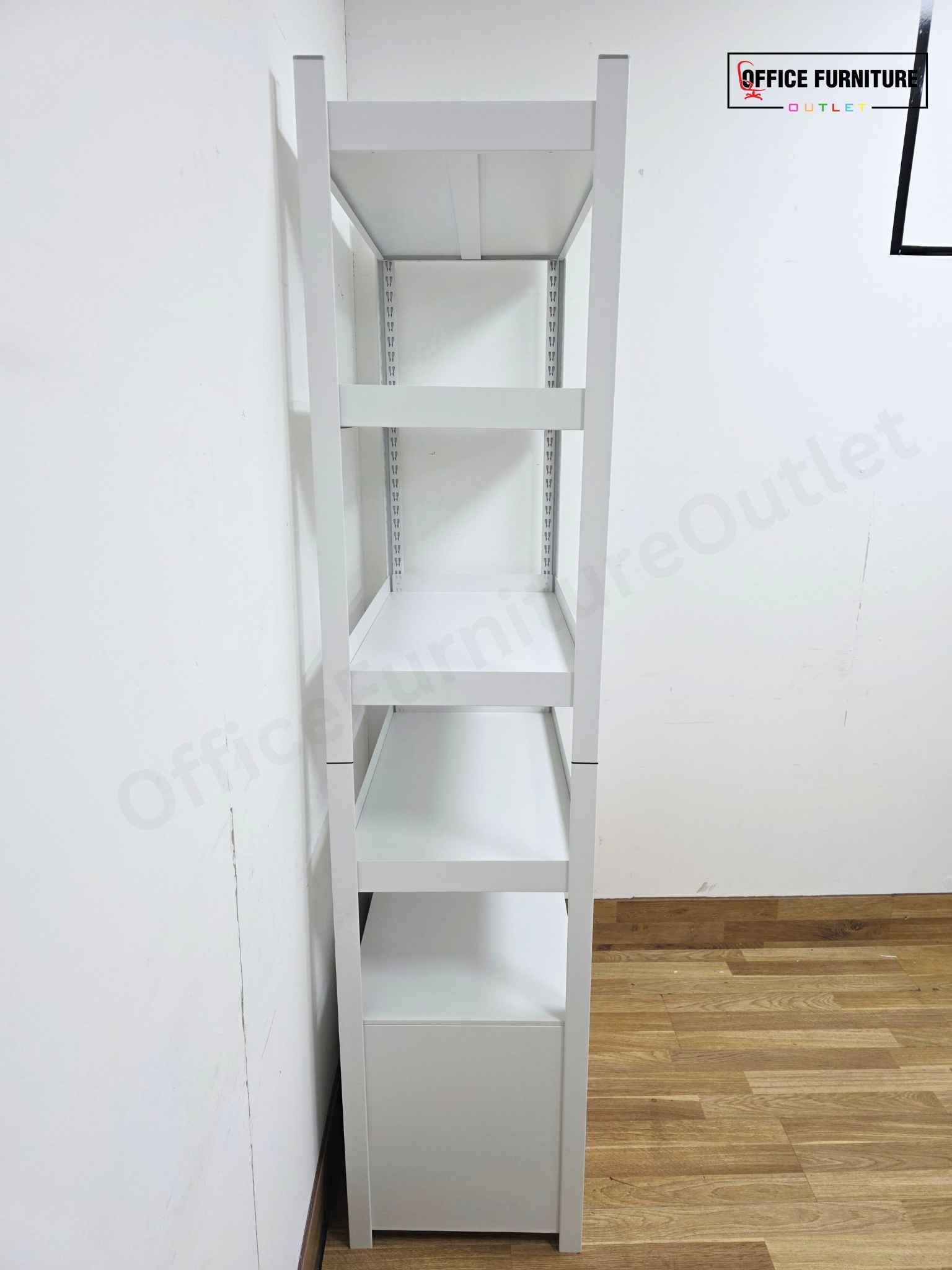 This metal storage racking unit with enclosed base cabinet offers a smart and versatile storage solution for offices, studios, workshops, and home workspaces. Featuring open metal shelving above and a lockable enclosed cabinet at the bottom, it provides the perfect balance between easy-access storage and concealed organisation. The unit is constructed from durable metal, finished in a clean white with a contrasting coloured cabinet front, giving it a modern and professional appearance.